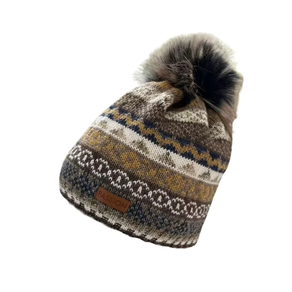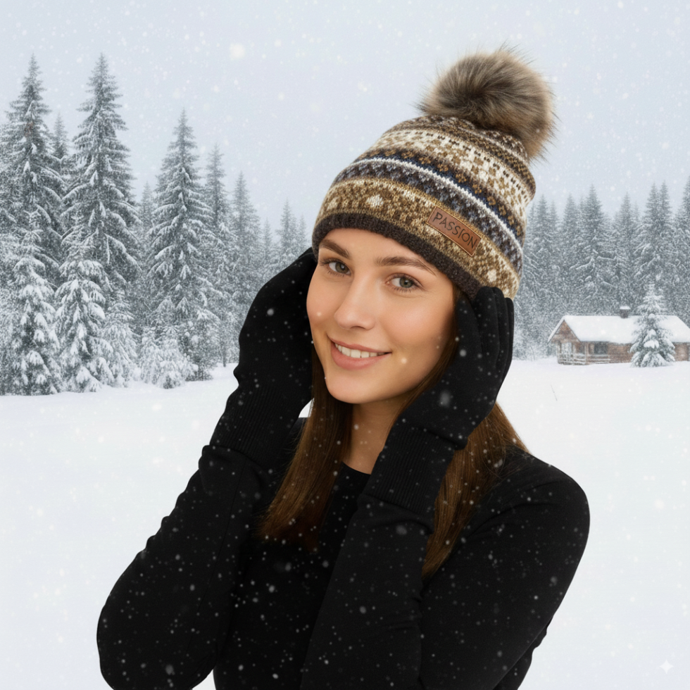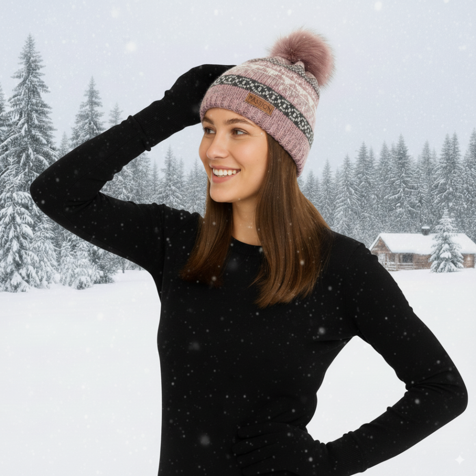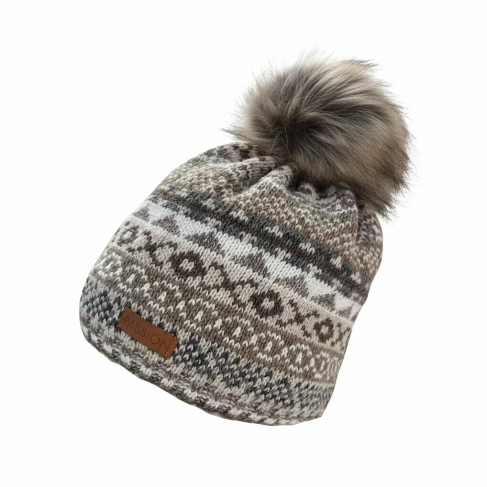 Stay warm and stylish with the Arielle Fair Isle Knitted Beanie, a cozy women’s winter hat featuring a classic Nordic pattern and a chic faux fur pom pom. Expertly crafted in the EU, this fleece-lined beanie combines comfort, warmth, and premium quality for the coldest days.