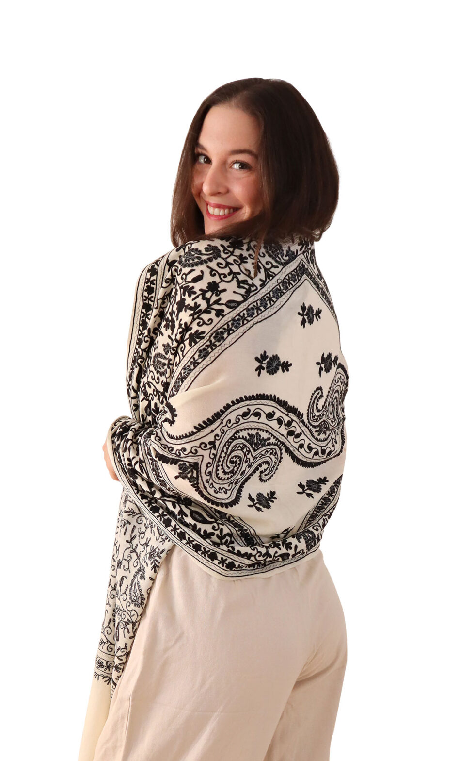Wrap yourself in timeless elegance with this classic Kashmiri shawl, beautifully crafted with intricate black floral embroidery on a soft beige base. Inspired by the heritage of Kashmir, this shawl combines comfort, warmth, and luxury—making it a versatile accessory for both casual outings and formal occasions.