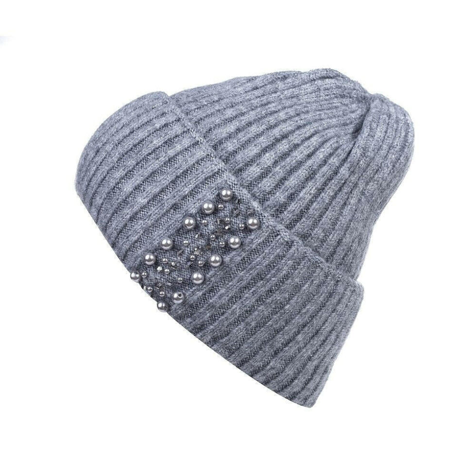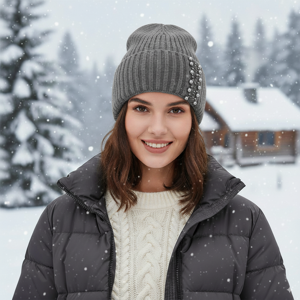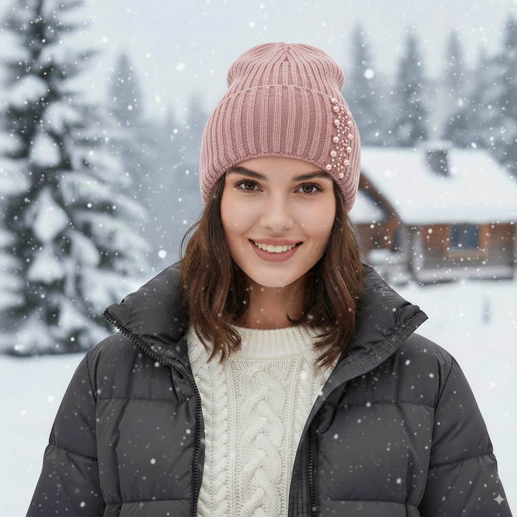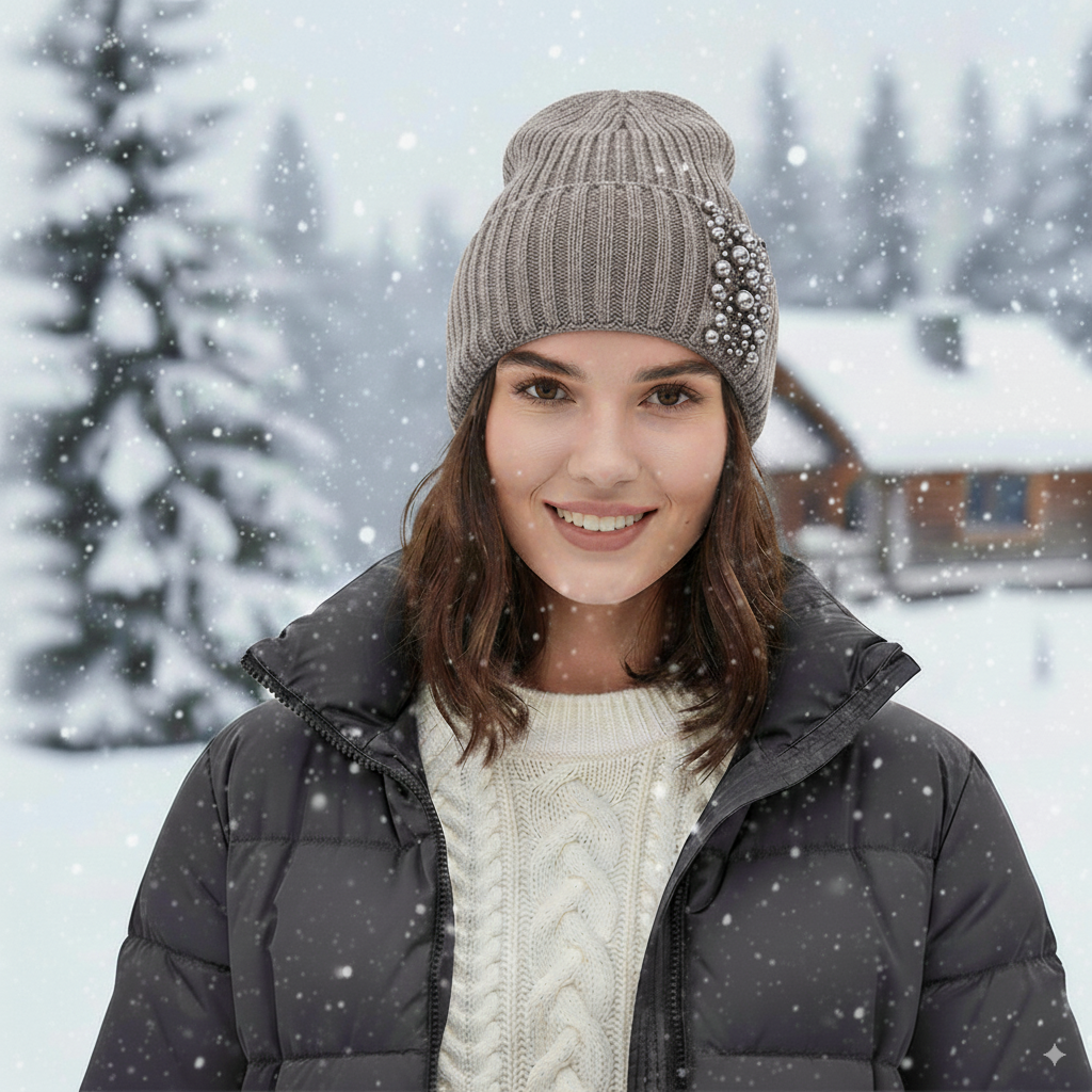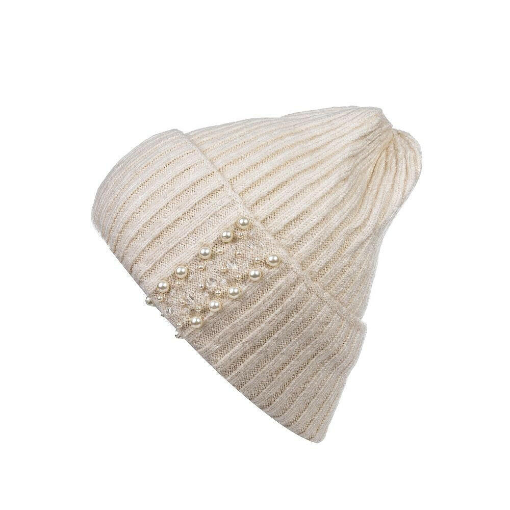 Elegant Pearl Beanie – Ribbed Knit Winter Hat for Women