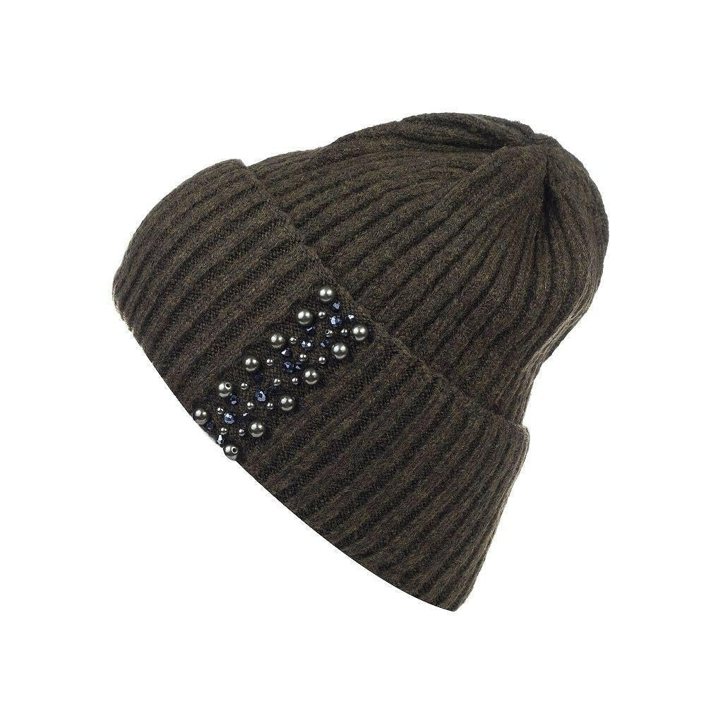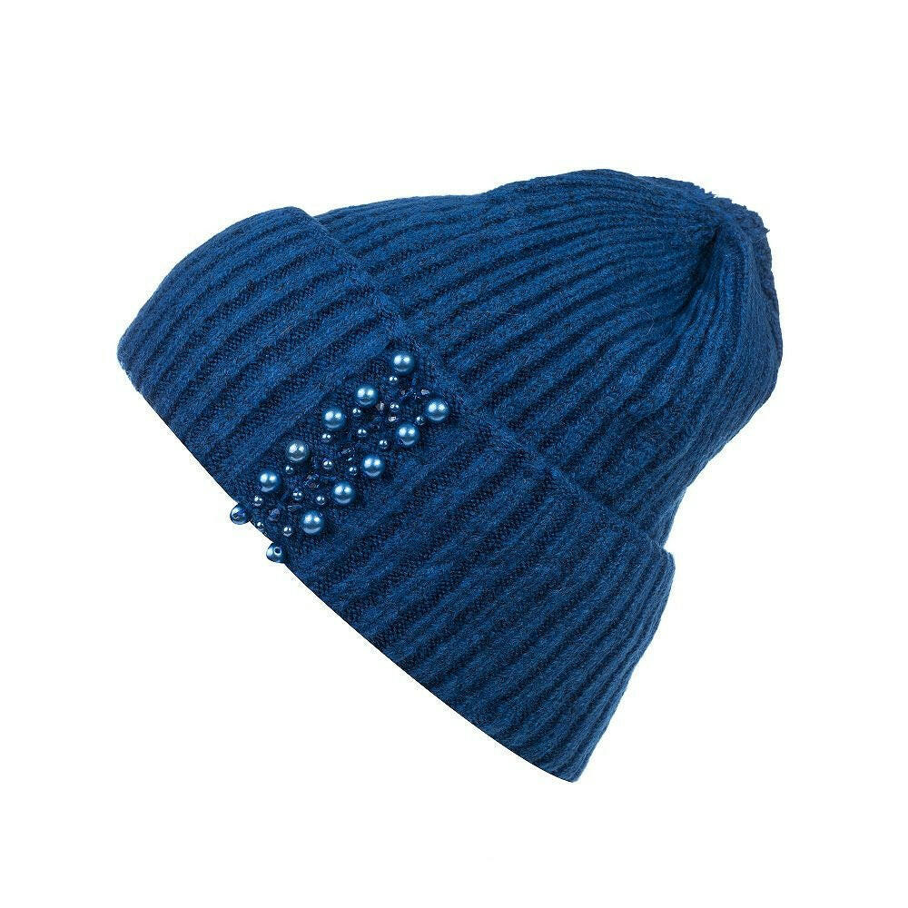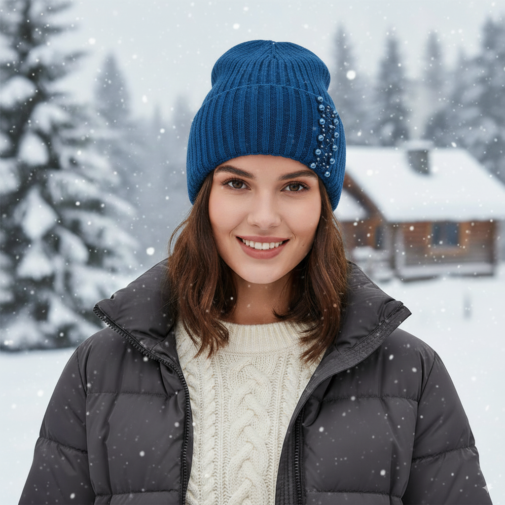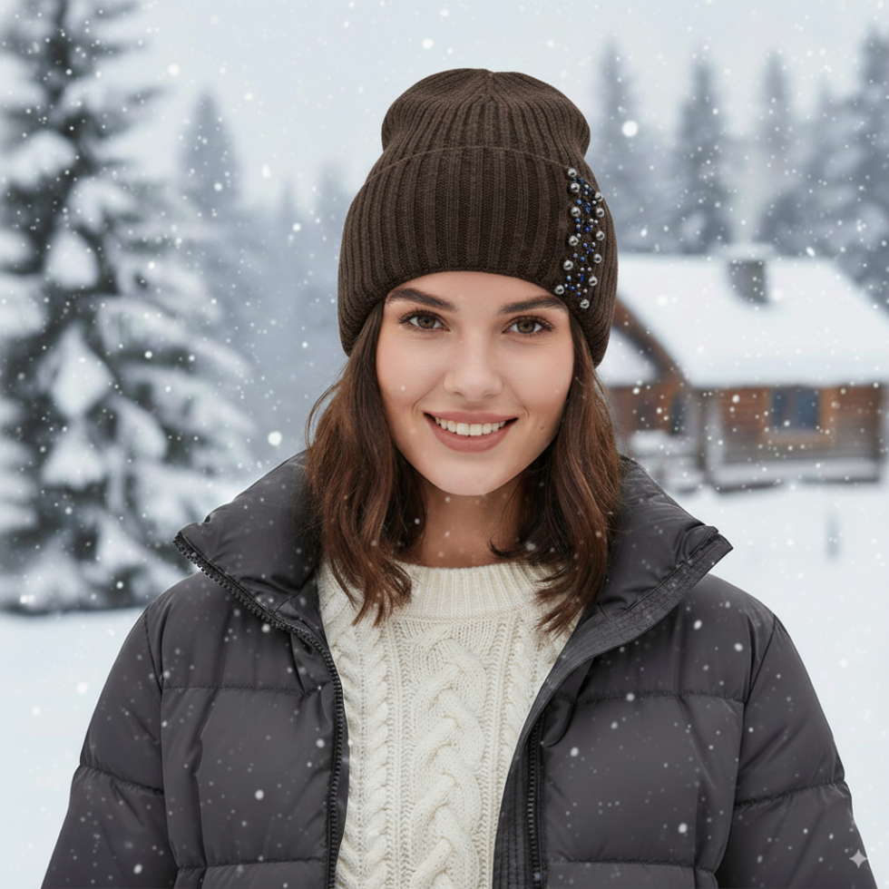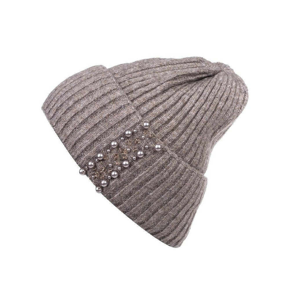 Elegant Pearl Beanie – Ribbed Knit Winter Hat for Women