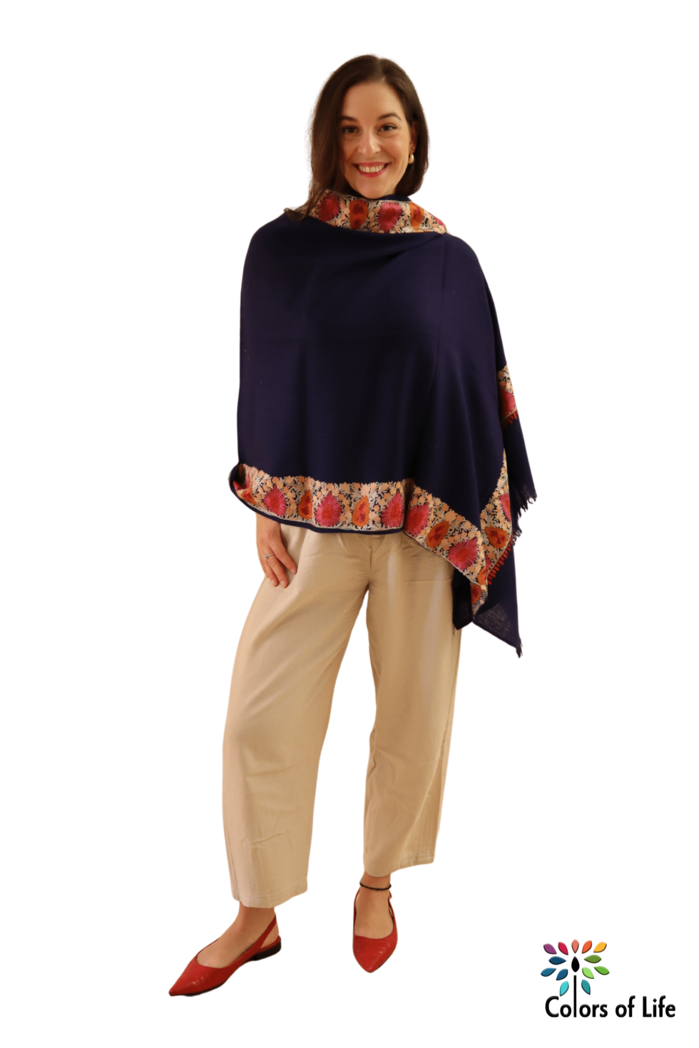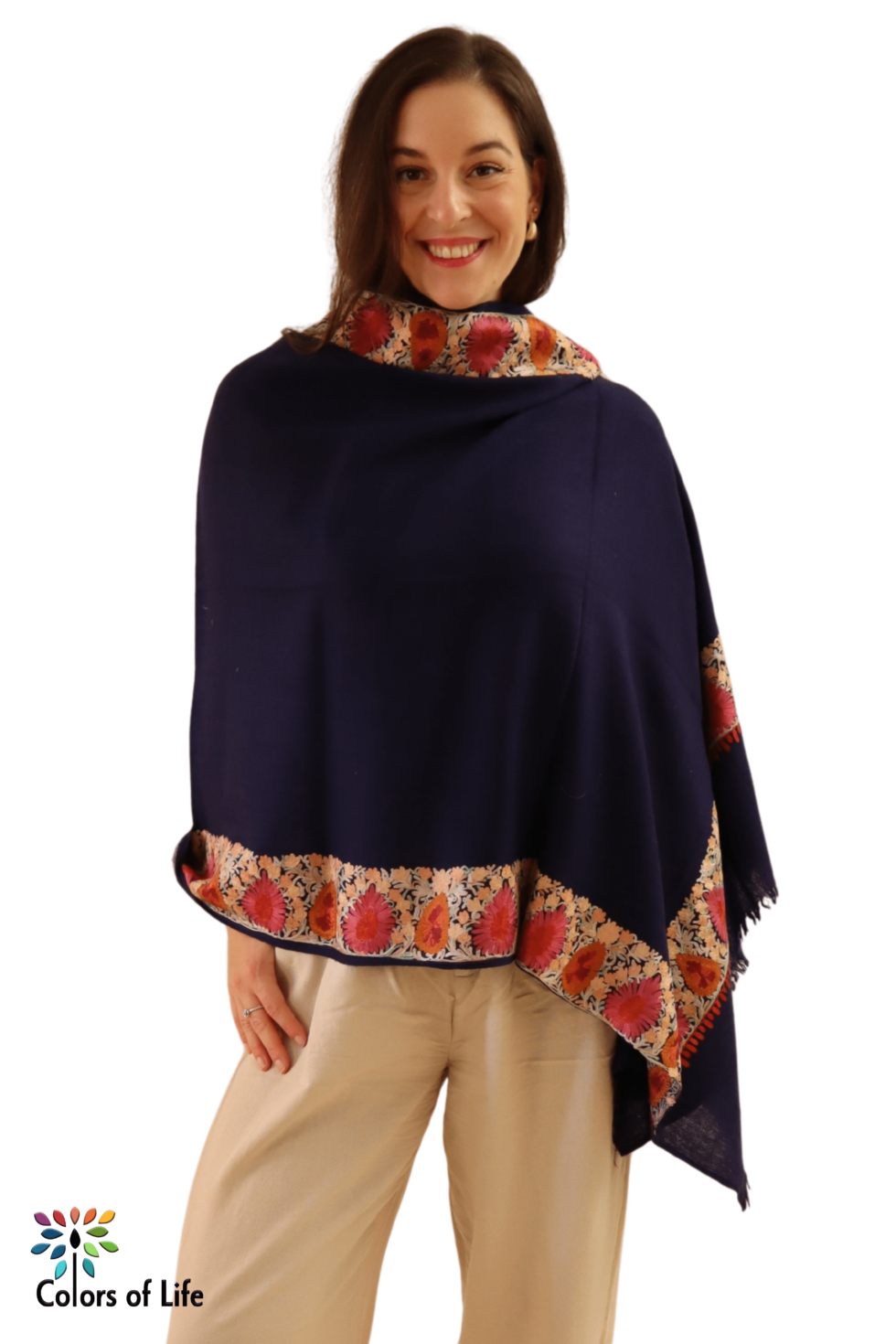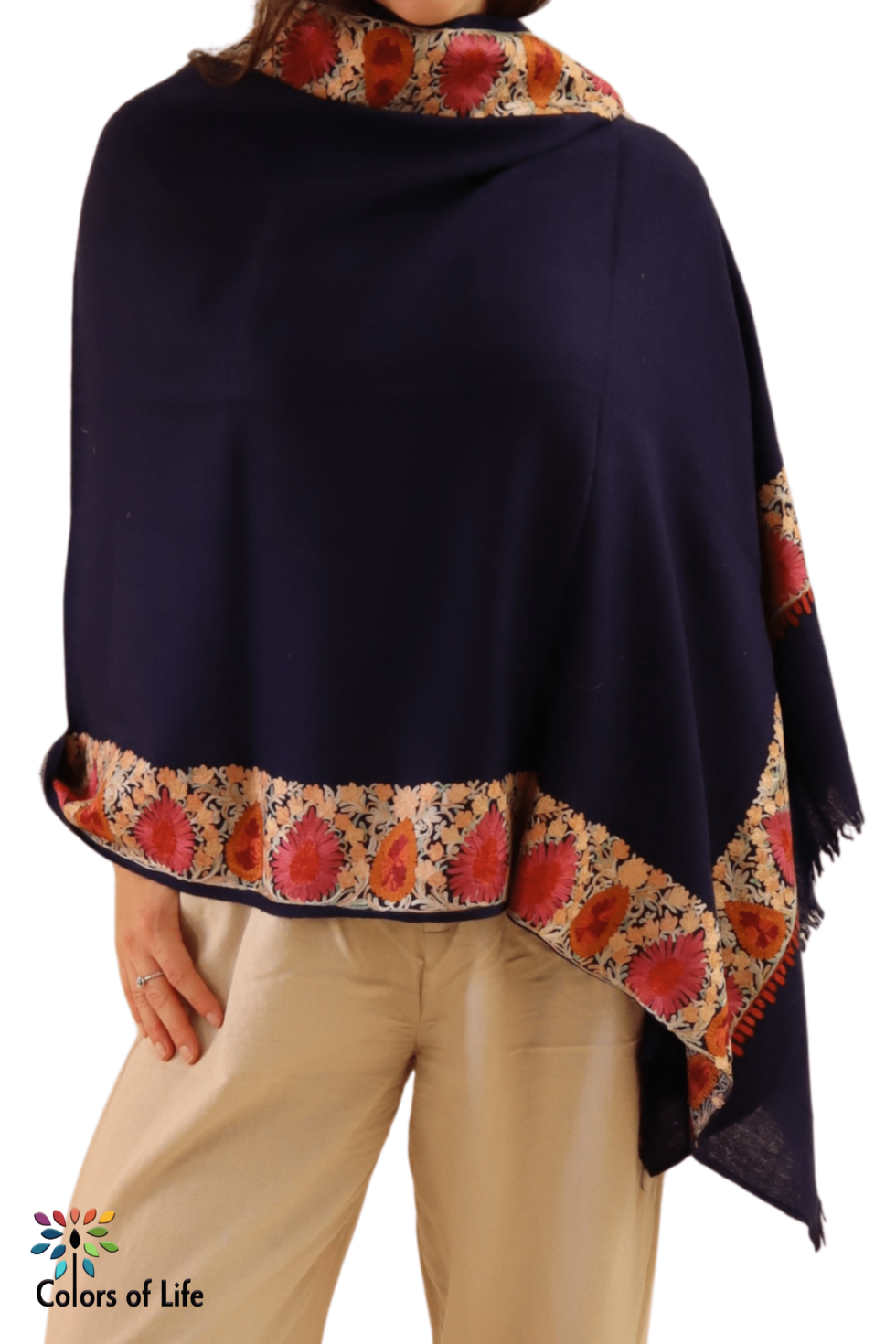 Step into timeless elegance with our Navy Blue Floral Border Embroidered Shawl, designed to add sophistication and warmth to your winter wardrobe. This premium shawl features a stunning embroidered floral border in shades of pink, orange, and gold — beautifully complementing the deep navy base.